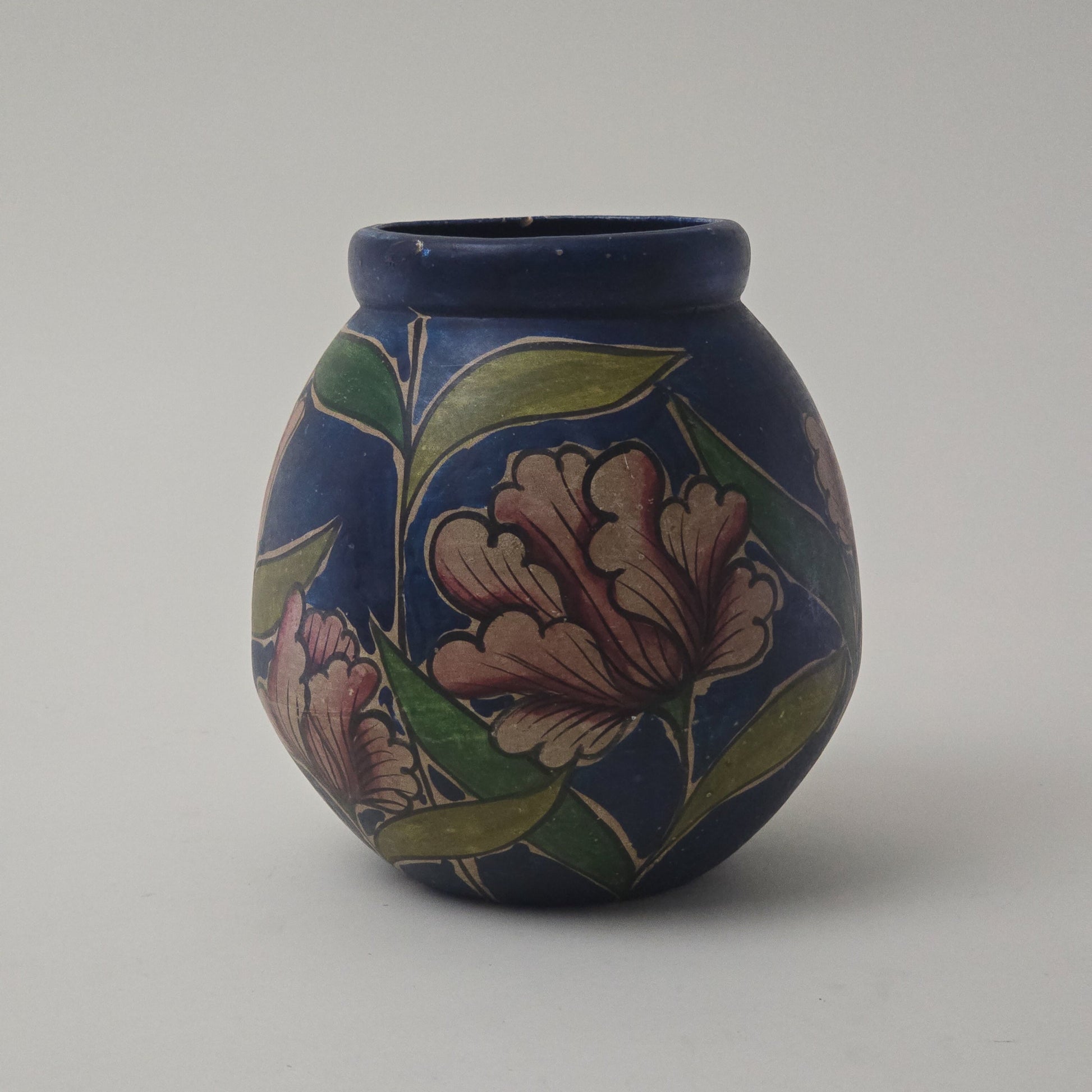 An exquisite fusion of craftsmanship and timeless artistry, this hand-painted ceramic vase is a captivating ode to natural beauty. Cloaked in a rich midnight blue glaze, the rounded silhouette is adorned with an elegant botanical motif featuring stylized blossoms and leafy vines in warm, earthy tones. Each brushstroke speaks to the artisan’s precision and vision, evoking a distinct Art Nouveau influence with a modern twist.