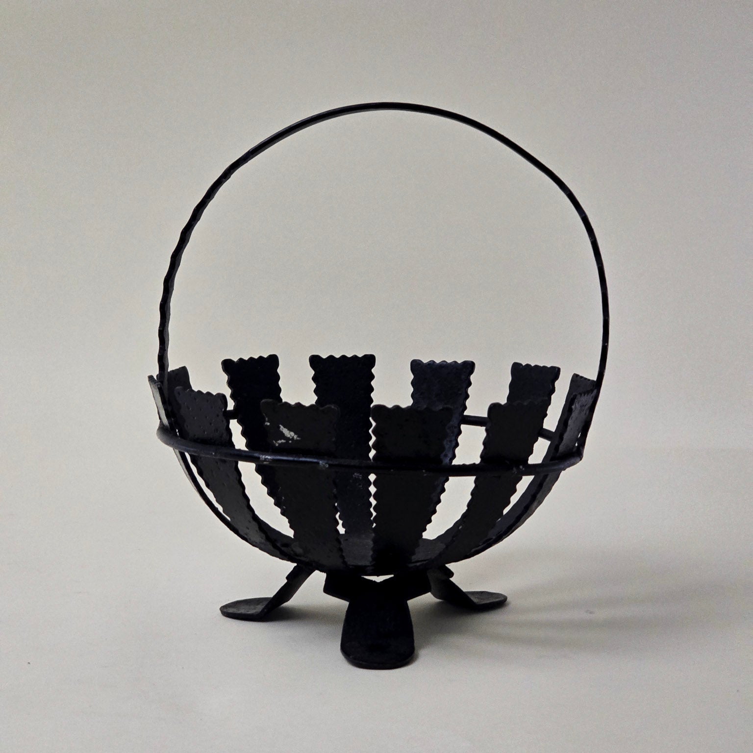 A bold statement in form and craftsmanship, this 1950s wrought iron fruit bowl channels mid-century design through a brutalist lens. Sculpted with precision, its sunburst-style openwork frame features scalloped iron panels radiating from a central footed base, crowned by a gracefully arched handle. The dark, hand-forged finish adds architectural depth and texture, making it a striking centerpiece for any modernist or eclectic space. Whether used functionally or as a sculptural accent, this piece offers timeless character and elevated style.